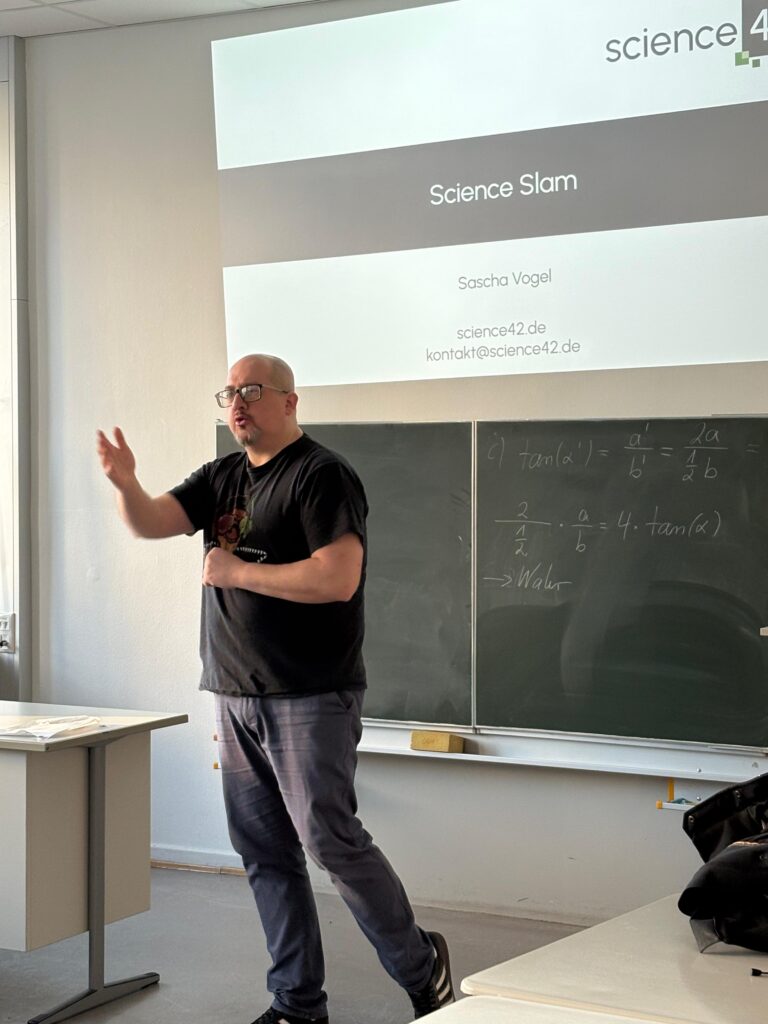 Wie ihr alle sicherlich wisst, treten bei einem Scienceslam junge Wissenschaftlerinnen und Wissenschaftler auf die Bühne, um in kurzen, lebendigen Vorträgen ihre Forschung spannend und zugänglich zu vermitteln. Dabei geht es nicht nur um Wissen, sondern auch um Kreativität und die Kunst des Erzählens. Das Publikum entscheidet am Ende, wer den besten Vortrag gehalten hat!