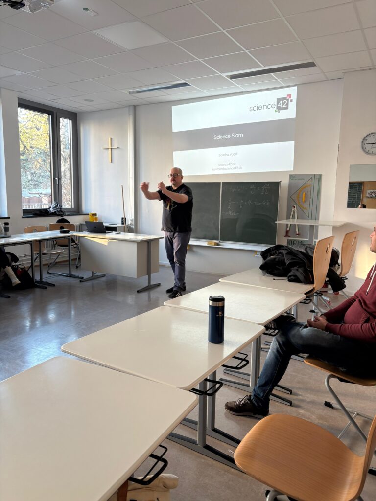 Damit alle Teilnehmer gut auf diese Veranstaltung vorbereitet sind, fand am Samstag, den 22.11.2025 ein Workshop in der Marienschule Offenbach dazu statt. Unter professioneller Anleitung lernten die Teilnehmenden, ihre eigenen wissenschaftlichen Themen packend zu präsentieren um danach, ihr neu erlerntes Wissen in der Vorbereitung ihres Vortrages zu integrieren. Danke an Dr. Sascha Vogel von den sciencebirds und dem Förderverein der Marienschule Offenbach