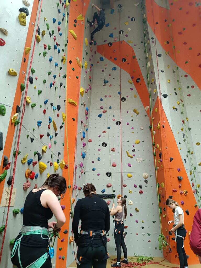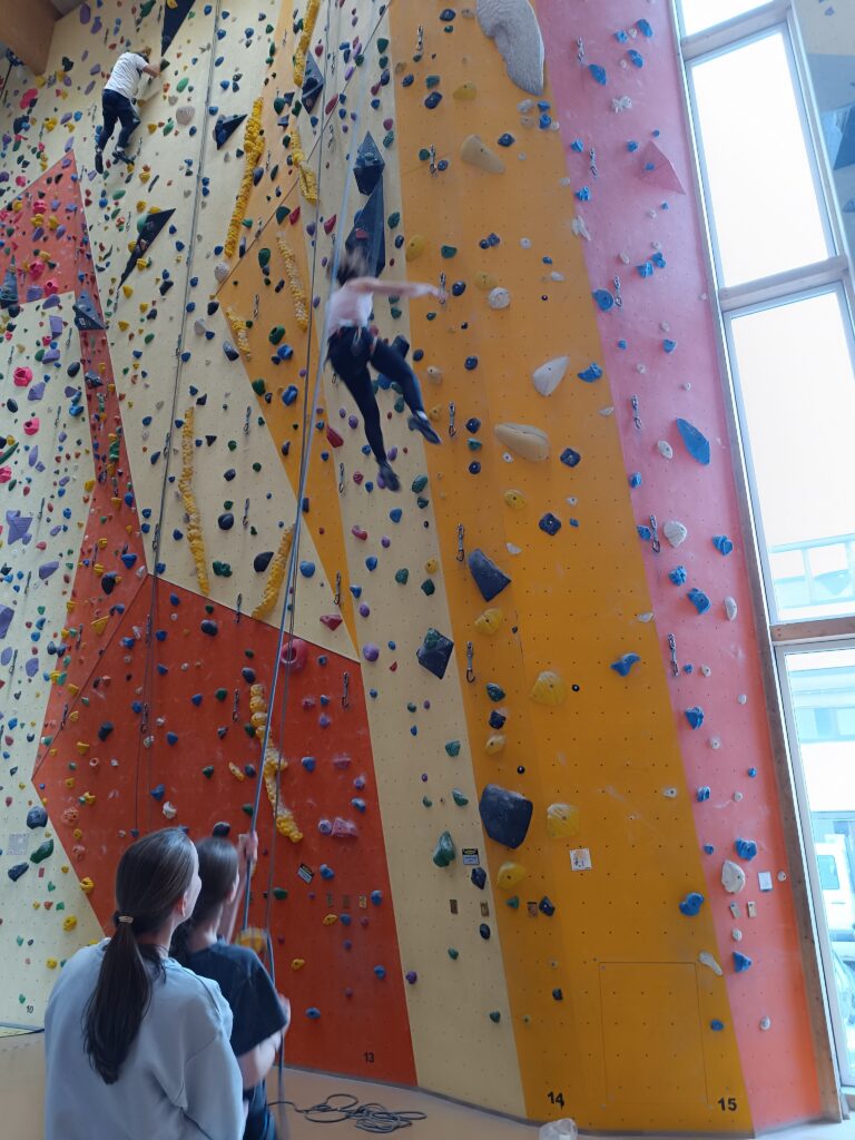 In der Kletterhalle begann der Kurs zunächst mit dem Bouldern, um sich schrittweise an Höhe und Bewegungsabläufe heranzutasten. Schnell zeigte sich, dass Klettern weit mehr verlangt als reine Kraft: Jede Route ist ein Rätsel, das gelöst werden will. Wo setze ich den nächsten Tritt? Wie teile ich meine Kraft ein? Welche Technik ist hier sinnvoll? Bewegungsplanung, Körperspannung und strategisches Denken spielen eine entscheidende Rolle – und die Schülerinnen lernten so, körperliche Herausforderung und geistige Konzentration gleichzeitig zu meistern.
