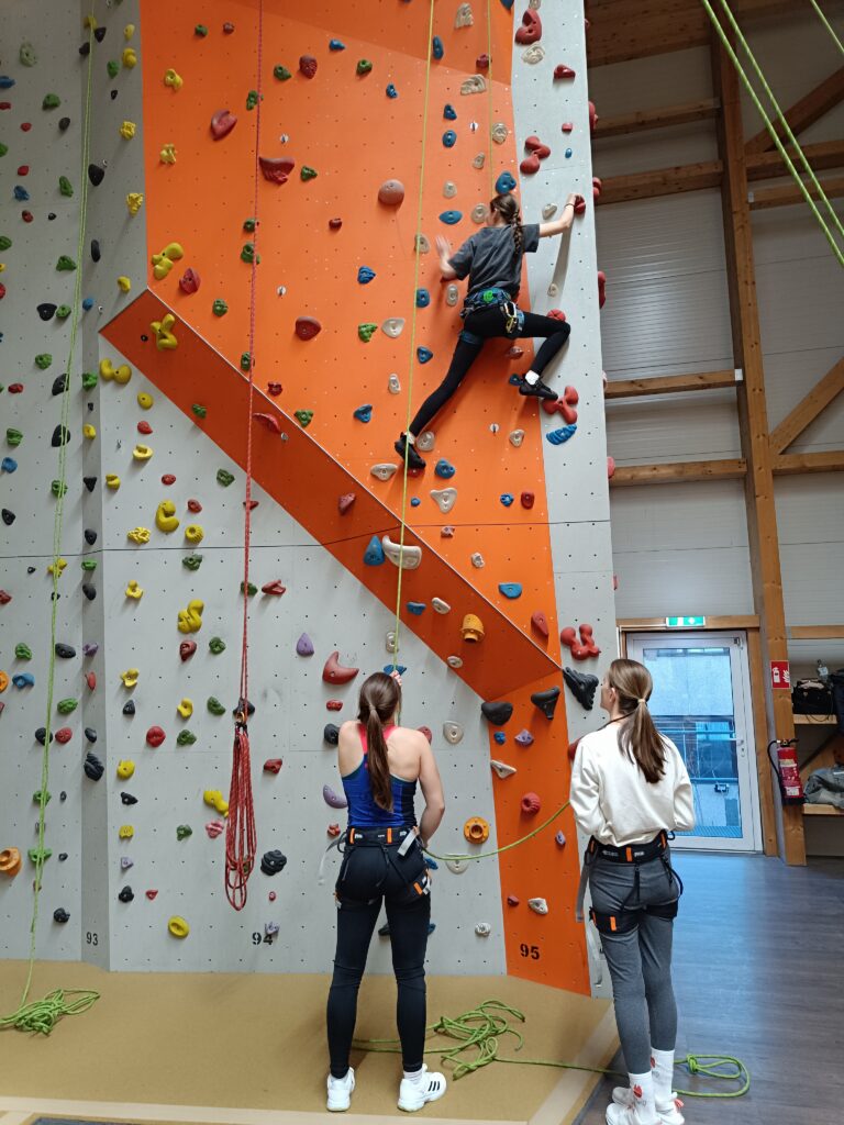 Beim anschließenden Seilklettern arbeiteten die Schülerinnen in Dreier-Seilschaften. Sie wechselten zwischen Klettern, Sichern und Beobachten. Besonders beeindruckend war zu beobachten, wie sich anfänglicher Respekt vor der Höhe in wachsendes Selbstvertrauen verwandelte.