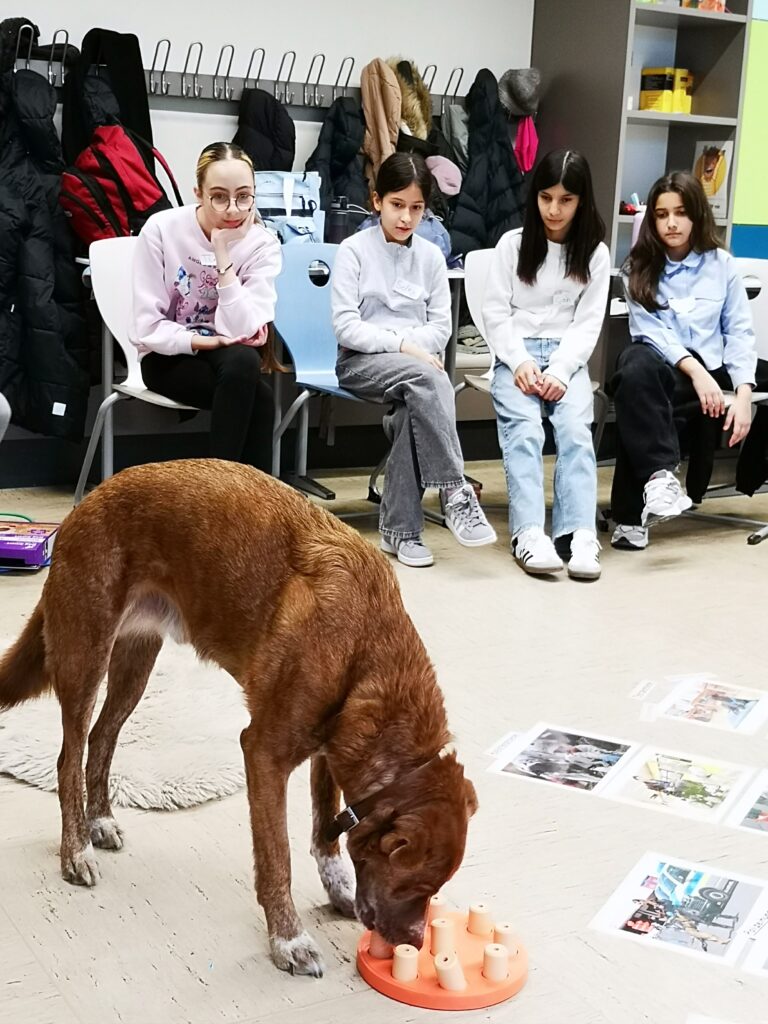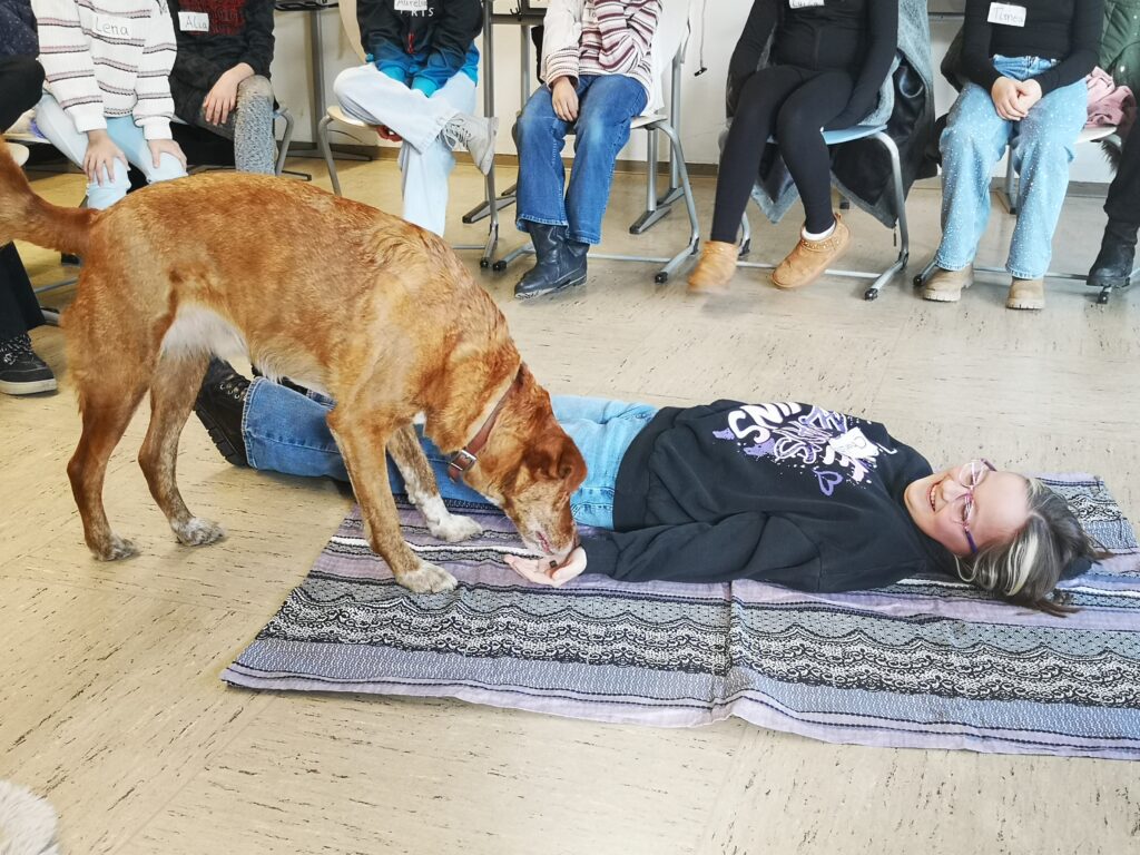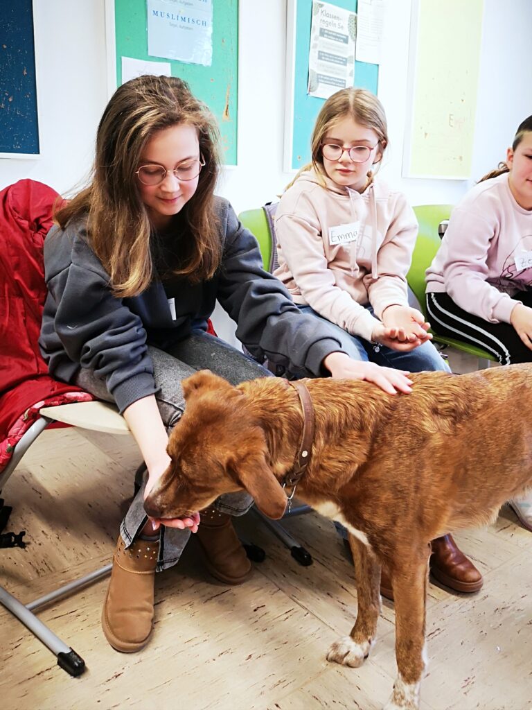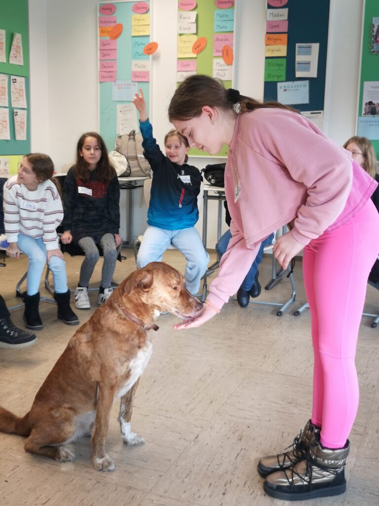 Auch in diesem Jahr begeisterte Schulhund Pelle wieder zwei 5. Klassen. Die Schülerinnen der 5d und 5e lernten zum Beispiel viel über die Körpersprache von Hunden, wie man sich fremden Hunden richtig nähert und welche Aufgaben Hunde im Dienst des Menschen übernehmen.